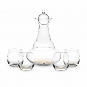Set Carafe Fleur de Vie avec 4 verres Mythos Or 23.8 CarratsUn set raffiné composé d'une carafe soufflée à la bouche et de quatre verres assortis, ornés de la Fleur de Vie et d'un symbole imprimé à...