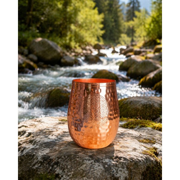 Cette coupe en cuivre, ornée du symbole de la Fleur de Vie, unit matière naturelle et symbolique universelle dans un objet simple et élégant.